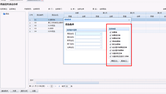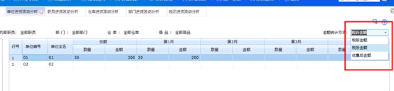由于商品不關(guān)聯(lián)單據(jù)上的優(yōu)惠后金額,所以截圖這里只有稅前、稅后兩種,其他的單位、職員、倉庫、部門、地區(qū)波動(dòng)分析表都是可以選擇三種: