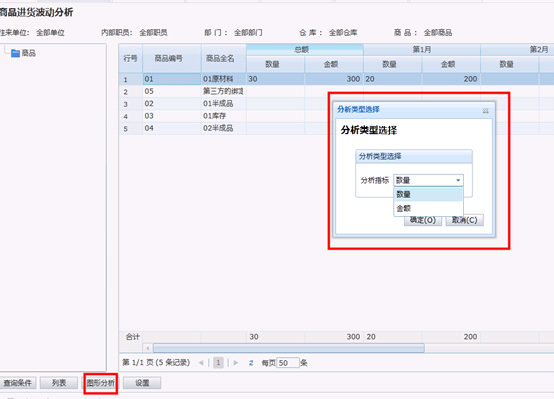 5、也可以直觀的通過圖形報(bào)表去查看數(shù)量或金額的波動(dòng)情況,左下角點(diǎn)擊圖形分析即可: