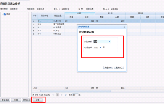 2、查詢條件里點(diǎn)確定后,顯示出報(bào)表,注意報(bào)表左下方有個(gè)【設(shè)置】按鈕,根據(jù)您的需要選擇對(duì)應(yīng)的時(shí)間,以及統(tǒng)計(jì)方式:選擇月報(bào)、季度報(bào)、每月周報(bào)、每月日?qǐng)?bào)四種波動(dòng)周期,以及自定義周期。注意時(shí)間是按自然月統(tǒng)計(jì)的,單據(jù)錄單日期在6月,數(shù)據(jù)就統(tǒng)計(jì)在6月中,不是按月結(jié)存統(tǒng)計(jì)。