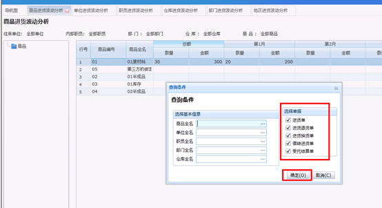 1、以進(jìn)貨波動(dòng)分析舉例,首先打開商品進(jìn)貨波動(dòng)分析表,數(shù)據(jù)查詢-進(jìn)貨查詢-進(jìn)貨波動(dòng)分析-商品進(jìn)貨波動(dòng)分析,點(diǎn)開后彈出查詢條件,可以根據(jù)您的需要選擇條件,如果不選擇,就默認(rèn)是所有的數(shù)據(jù)。查詢條件中有顯示默認(rèn)會(huì)統(tǒng)計(jì)的單據(jù)類型,也可以手動(dòng)取消。