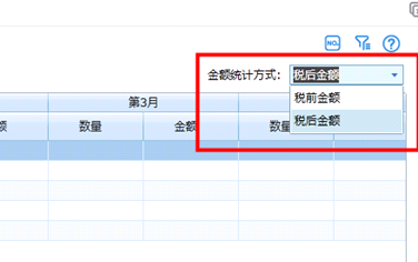 3、報(bào)表左上角有金額的統(tǒng)計(jì)方式,表體的金額可以選擇統(tǒng)計(jì)稅前還是稅后: