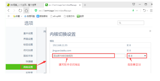 ![]() 點擊內(nèi)核切換設(shè)置,填寫軟件的訪問地址、選擇兼容IE8(如圖)。