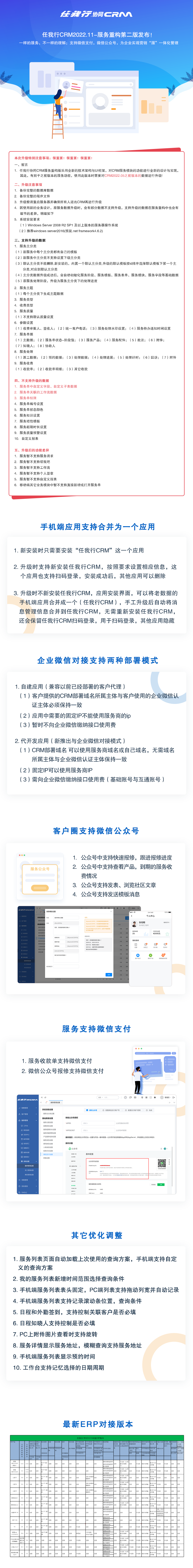 發(fā)表時間:2022-11-19 10:13作者:小管君 每一個版本的推出,都代表著任我行咨詢對于企業(yè)管理認(rèn)知的進(jìn)步和升級,任我行協(xié)同CRM服務(wù)重構(gòu)第二版硬核功能,全新升級,構(gòu)建從拉新、到運(yùn)營、轉(zhuǎn)化、復(fù)購的完整閉環(huán)鏈路,以生態(tài)的方式,賦能品牌的數(shù)字化,幫助企業(yè)降本增效、長效經(jīng)營,實現(xiàn)線上線下一體化、公域私域聯(lián)合運(yùn)營,實現(xiàn)營銷“服”一體化管理。 小伙伴們可聯(lián)系進(jìn)行軟件升級,以下是本次版本更新的功能: