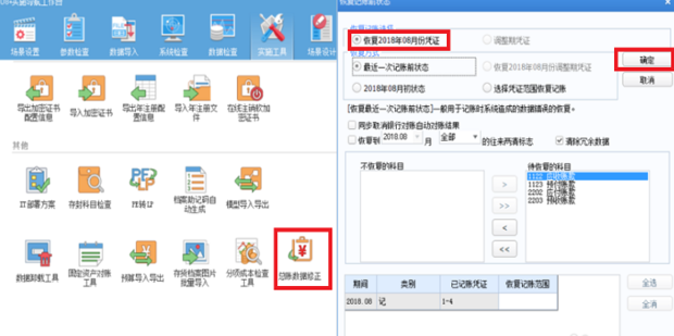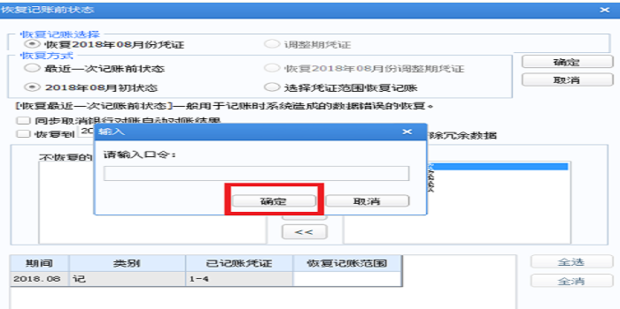 點(diǎn)擊總賬數(shù)據(jù)修正,會(huì)彈出“恢復(fù)記賬前狀態(tài)”對(duì)話框?;謴?fù)方式下選擇“恢復(fù)2018年08月初狀態(tài)”后!點(diǎn)擊“確定”!