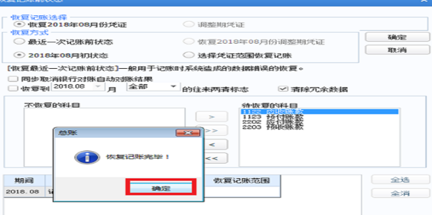 彈出恢復(fù)記賬完畢,點(diǎn)擊確定,這樣可以對(duì)2018年8月份憑證取消審核后,進(jìn)行修改!