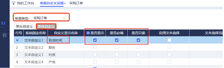 業(yè)務(wù)人員在做單時(shí)要求必須錄入某個(gè)字段的數(shù)據(jù),但由于是單據(jù)的非必填項(xiàng),所以常常會(huì)忘記錄入,那么該如何解決呢?請(qǐng)查看處理方法吧。 以采購(gòu)訂單的到貨時(shí)間舉例,若沒有填到貨日期,則保存單據(jù)時(shí)提示必填。 啟用采購(gòu)訂單表體的一個(gè)自定義字段,勾選:顯示、必填、只讀。自定義顯示名稱改成:到貨時(shí)間。