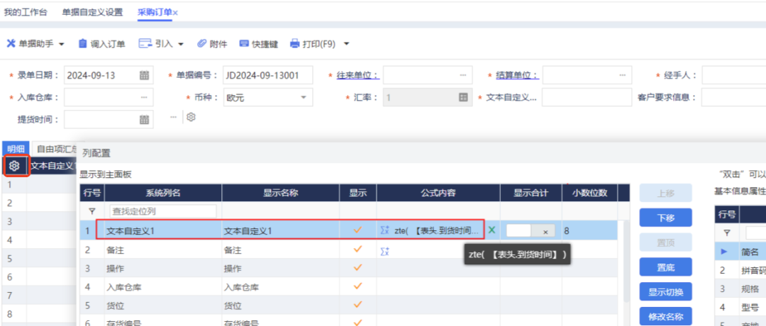 對(duì)該自定義字段設(shè)置公式:zte( 【表頭.到貨時(shí)間】 )。