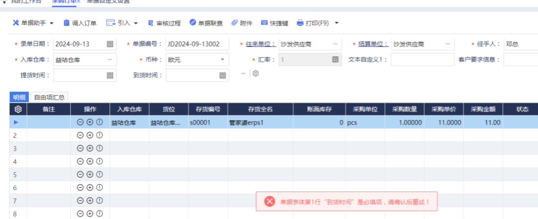 若沒有填寫到貨日期,則會(huì)提示:?jiǎn)螕?jù)表體第1行 “到貨時(shí)間”是必填項(xiàng),請(qǐng)確認(rèn)后重試!