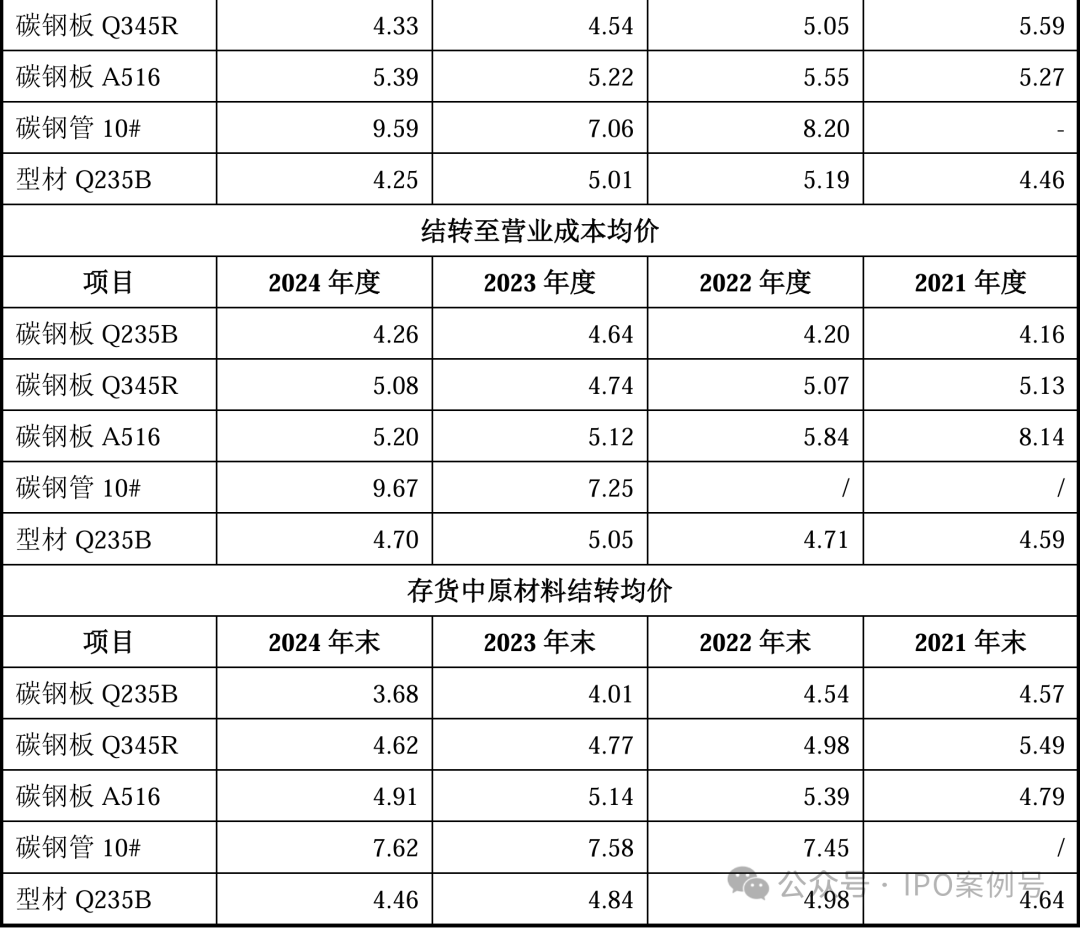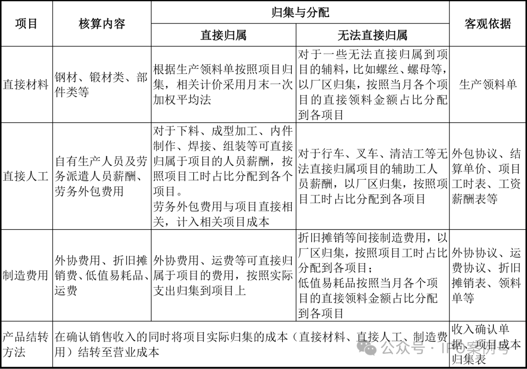 發(fā)表時間:2025-06-22 18:53作者:小管君 ![]() 根據(jù)申請文件,公司產(chǎn)品的主要原材料為鋼材、鍛材類、部件類。報告期內,公司主營業(yè)務成本主要由原材料及制造費用構成,且成本結構波動較大,其中2022年度直接材料、直接人工占比相對低。 請發(fā)行人:結合具體業(yè)務流程說明直接材料、直接人工(員工薪酬、勞務派遣及勞務外包成本)、制造費用(外協(xié)費用、折舊攤銷費、低值易耗品、運費)進行歸集、分配、結轉的方法及客觀依據(jù),重點分析公共材料、無法直接歸屬項目的直接人工、制造費用等明細成本的歸集結轉依據(jù)及其真實準確性;以表格形式列示成本倒軋過程并分析差異原因,各細分產(chǎn)品生產(chǎn)成本(料工費)、銷售成本、存貨成本的勾稽關系;說明主要原材料采購均價、領用均價、結轉至營業(yè)成本均價、存貨中原材料結轉均價的差異情況及其原因;結合前述情況說明相關成本核算的完整性、準確性。 【公司業(yè)務簡介】長江能科是一家專注于能源化工專用設備的設計、研發(fā)、制造和服務的國家級專精特新“小巨人”企業(yè)。公司主要產(chǎn)品包括電脫設備、分離設備、換熱設備、存儲設備、固碳設備、氫能設備等能源化工專用設備以及助劑和技術服務,廣泛應用于油氣工程、煉油化工、海洋工程、清潔能源等領域。 (一)結合具體業(yè)務流程說明直接材料、直接人工(員工薪酬、勞務派遣及勞務外包成本)、制造費用(外協(xié)費用、折舊攤銷費、低值易耗品、運費)進行歸集、分配、結轉的方法及客觀依據(jù),重點分析公共材料、無法直接歸屬項目的直接人工、制造費用等明細成本的歸集結轉依據(jù)及其真實準確性 公司直接材料、直接人工、制造費用歸集、分配、結轉的方法及客觀依據(jù)情況如下: ![]() 如上所述,公司公共材料、無法直接歸屬項目的直接人工、制造費用是公司在生產(chǎn)過程中發(fā)生的、不能直接歸屬于某一特定項目的成本,由于這些費用與多個項目或生產(chǎn)活動相關,無法直接追溯到某一具體項目,因此公司在成本核算過程中按照直接領料金額占比、項目工時占比作為合理分配方式分配到各項目。該分配方式符合公司實際經(jīng)營情況并能夠反映實際項目耗用情況,與同行業(yè)可比上市公司間接費用的歸集、分配方法不存在顯著差異,具體對比情況如下: ![]() ![]() 綜上所述,公司成本核算方法合理,客觀依據(jù)充分,與同行業(yè)可比上市公司相比,不存在顯著差異。 (二)以表格形式列示成本倒軋過程并分析差異原因,各細分產(chǎn)品生產(chǎn)成本(料工費)、銷售成本、存貨成本的勾稽關系; 1、成本倒軋過程 ![]() ![]() 經(jīng)成本倒軋計算,差異金額較小,公司存貨余額變動與營業(yè)成本的變動相匹配,成本核算真實、準確。 2、各細分產(chǎn)品生產(chǎn)成本(料工費)、銷售成本、存貨成本的勾稽關系 2021-2024年度,公司產(chǎn)品生產(chǎn)成本(料工費)、銷售成本、存貨成本的勾稽關系如下: ![]() ![]() 綜上所述,各細分產(chǎn)品生產(chǎn)成本(料工費)、銷售成本、存貨成本勾稽一致。 (三)說明主要原材料采購均價、領用均價、結轉至營業(yè)成本均價、存貨中原材料結轉均價的差異情況及其原因 2021-2024年度,主要原材料采購均價、領用均價、結轉至營業(yè)成本均價、存貨中原材料結轉均價的差異情況如下: 1、鋼材 2021-2024年度,公司主要型號鋼材的采購均價、領用均價、結轉至營業(yè)成本均價、年末存貨中原材料結轉均價情況如下: ![]() ![]() 受市場價格波動、采購、領用及結轉時間錯配等因素影響,導致鋼材采購價格變動傳遞至領用均價、結轉至營業(yè)成本均價、存貨中原材料結轉均價產(chǎn)生一定的差異。 2021-2024年度,除2021年度碳鋼板A516、2024年度碳鋼管10#原材料結存均價與采購價、領用均價、結轉至營業(yè)成本均價差異大外,其余型號鋼材采購均價、領用均價、結轉至營業(yè)成本均價、存貨中原材料結轉均價基本維持在同一價格區(qū)間,差異波動較小。 2021年度,受鋼材市場價格上漲,當期碳鋼板A516的采購、領用均價高,而結轉均價亦相對高,主要受海工英派爾的一二級分離器項目結轉影響。該項目規(guī)模大,對抗酸、抗腐蝕等性能要求高,前期采購的碳鋼板A516以具有抗氫致開裂(HIC)和抗硫化物應力腐蝕開裂(SSCC)能力為主,采購價格高于普通A516鋼板所致。2021年末,存貨中原材料結存的碳鋼板A516主要系前期采購尚未使用完畢的普通碳鋼板,因此存貨中原材料結轉均價低。 2024年度碳鋼管10#的采購、領用、結轉主要系因中海石油(中國)有限公司成套電脫設備項目而形成。受零星采購、特殊加工等影響,當期碳鋼管10#采購單價顯著高于以前年度,因此鋼管10#的采購、領用、結轉均價高于因前期采購而結存原材料的均價,具有合理性。 2、鍛件 2021-2024年度,公司鍛件的采購均價、領用均價、結轉至營業(yè)成本均價、年末存貨中原材料結轉均價情況如下: ![]() (1)碳鋼材質鍛件 2022年度、2023年度,公司碳鋼材質鍛件的采購以裕龍石化的換熱設備項目為主,采購規(guī)模大,采購單價低,拉低了當期鍛件的平均采購單價,而該項目于2023年度確認收入、結轉成本,該等采購與結轉的時間錯配,導致2023年度碳鋼材質的成本結轉均價低。2022年度確認收入