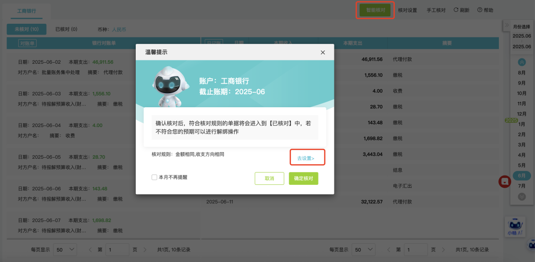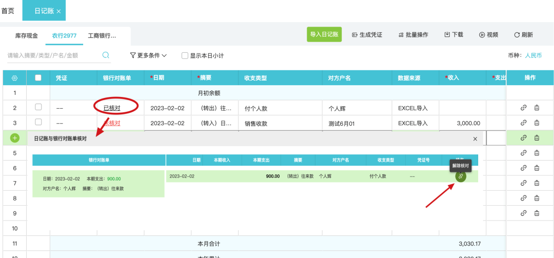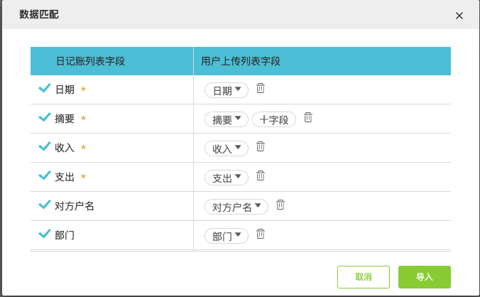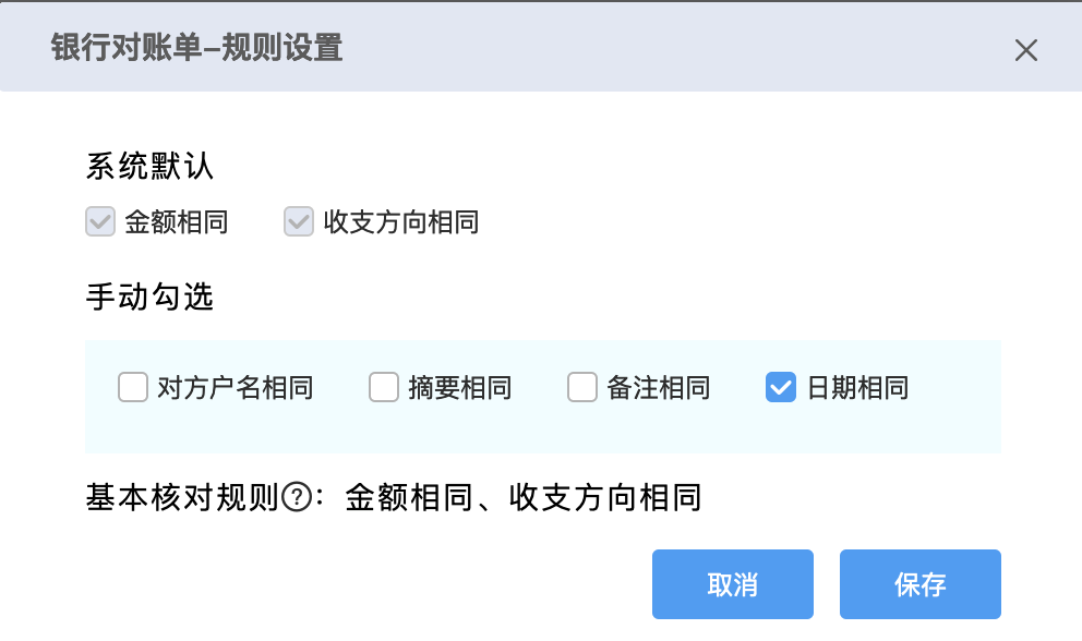 4.刪除銀行對(duì)賬單 場(chǎng)景1:生成了日記賬-會(huì)同步刪除日記賬; 場(chǎng)景2:核對(duì)了日記賬-會(huì)取消核對(duì)。 ![]() 5.智能核對(duì) 系統(tǒng)提供智能核對(duì)和手工核對(duì)兩種核對(duì)方式,用于銀行對(duì)賬單與日記賬的核對(duì)匹配。 可以設(shè)置智能核對(duì)規(guī)則,系統(tǒng)將按照設(shè)置規(guī)則完成智能核對(duì),未核對(duì)上的數(shù)據(jù)用戶仍可以根據(jù)實(shí)際情況進(jìn)行手工核對(duì)。 ![]() 系統(tǒng)默認(rèn)規(guī)則按照:金額相同、收支方向相同進(jìn)行核對(duì),用戶可以根據(jù)企業(yè)實(shí)際資金管理要求調(diào)整智能核對(duì)規(guī)則。智能核對(duì)規(guī)則設(shè)置(記賬規(guī)范可勾選更多條件),匹配規(guī)則時(shí)順序:對(duì)方戶名、日期(優(yōu)先相同、其次最早)、摘要、備注。 ![]() ![]() 6.手工核對(duì) ● 手工核對(duì)規(guī)則(2個(gè)條件滿足一個(gè)即可):1)”金額相同”、“收支方向相同”;2)金額合計(jì)為0、收支方向相反。 ●不受智能核對(duì)規(guī)則限制。 ● 僅支持1對(duì)多(即1條銀行對(duì)賬單對(duì)應(yīng)多條日記賬)。 ![]() 注:期初差異:日記賬與期初差異可以核銷,規(guī)則是方向相同,日記賬金額小于等于期初差異。例:期初差異本期收入(貸方)1000元,后期銀行日記賬本期收入(借方)30元,則手工勾選后,期初差異剩余970元。 ![]() 7.取消核對(duì) 路徑1:【資金管理】-【日記賬與銀行對(duì)賬單核對(duì)】-【已核對(duì)】 ![]() 路徑2:【日記賬】-【已核對(duì)】 ![]() 3. 銀行對(duì)賬單多種采集功能目前系統(tǒng)支持銀行對(duì)賬單/銀行回單的采集方式包括:Excel版銀行對(duì)賬單導(dǎo)入、銀企云聯(lián)采集(部分銀行)、手工錄入; a. Excel版銀行對(duì)賬單導(dǎo)入 操作說(shuō)明1.導(dǎo)入路徑: 【資金管理】-【銀行對(duì)賬單】-【導(dǎo)入】 ![]() 【資金管理】-【日記賬】-【導(dǎo)入日記賬】 ![]() 如果導(dǎo)入模版字段存在匹配不上,或者用戶對(duì)于字段映射關(guān)系想要調(diào)整的,可以在數(shù)據(jù)匹配中修改對(duì)照關(guān)系。修改后系統(tǒng)將會(huì)記錄用戶的操作習(xí)慣,后續(xù)會(huì)按照修改要求優(yōu)先匹配。 ![]() ![]() 更多用友軟件操作問(wèn)題,可以聯(lián)系梁老師18110593406 長(zhǎng)按識(shí)別二維碼添加好友,及時(shí)解答 ![]() ![]() 點(diǎn)分享 ![]() 點(diǎn)收藏 ![]() 點(diǎn)點(diǎn)贊 ![]() 點(diǎn)在看 |