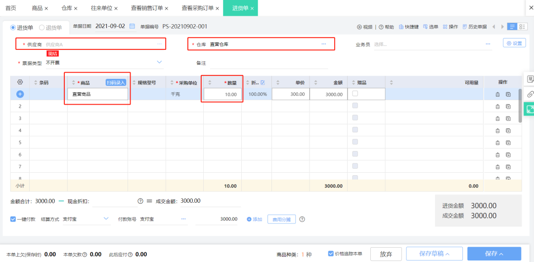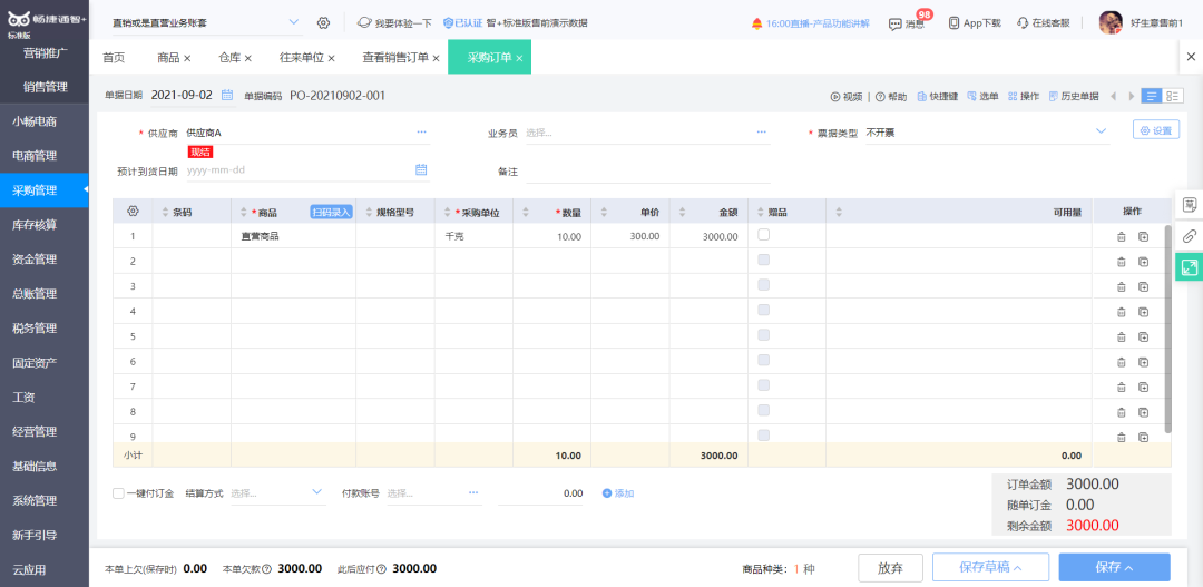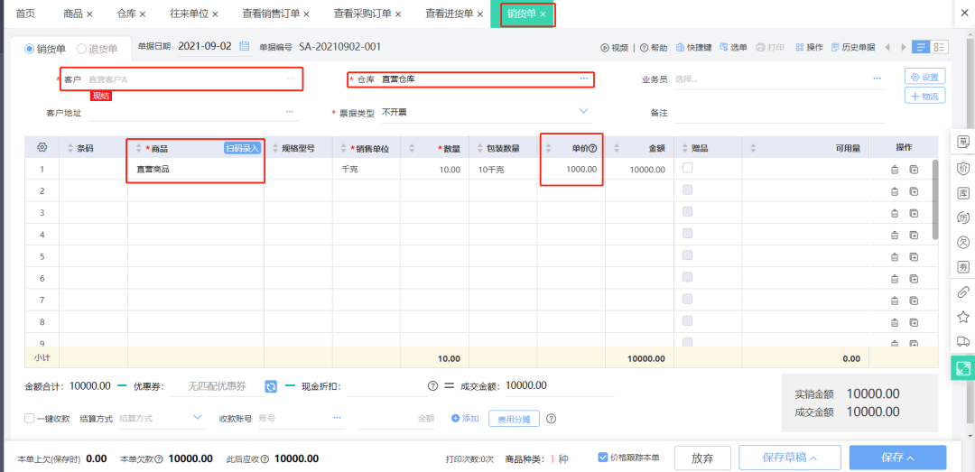 2、客戶下訂 銷售管理-銷售訂單錄入客戶訂單信息:選擇客戶,倉(cāng)庫(kù)選擇直運(yùn)(直營(yíng))倉(cāng)庫(kù),然后錄入好客戶訂購(gòu)的商品信息。