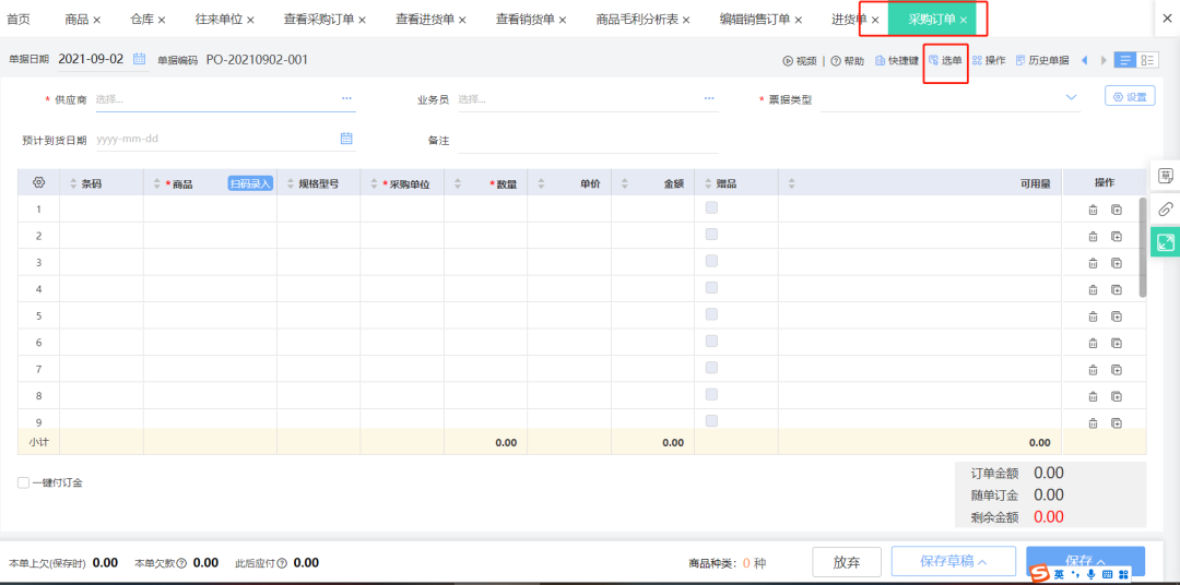 3、以銷定采 銷售訂單信息后,商家需要去找供應(yīng)商采購(gòu),打開(kāi)【采購(gòu)訂單】,然后點(diǎn)擊右上角【選單】,選擇客戶的“銷售訂單”,可以直接將銷售訂單信息帶入到采購(gòu)訂單中,即。
