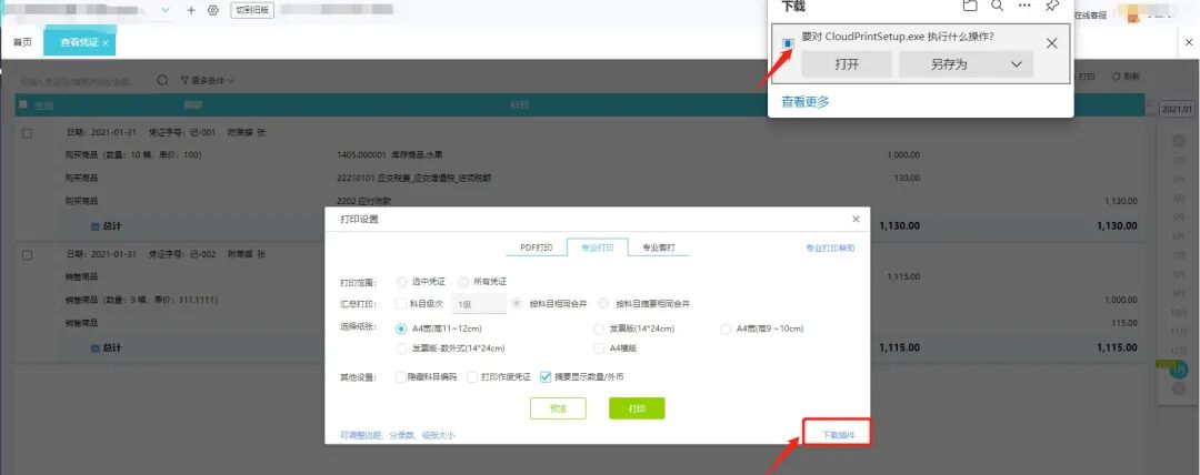 發(fā)表時間:2021-11-05 11:56作者:智能云財務(wù)軟件 【操作流程】 1. 首先登錄賬號進(jìn)入軟件中,進(jìn)入【總賬】-【查看憑證】的界面; 2. 舉專業(yè)版打印發(fā)票紙張為例:選中憑證為:2021-10-19,憑證號:005,點擊右上角【打印】按鈕,選擇專業(yè)打印,發(fā)票版進(jìn)行打印憑證,具體操作如下: ①如果是第一次且選擇的是專業(yè)打印/專業(yè)套打進(jìn)行打印憑證時,需要點擊右下角的【打印插件】,進(jìn)行下載網(wǎng)絡(luò)打印助手或點擊最下面的【預(yù)覽】界面下載插件都可以;
