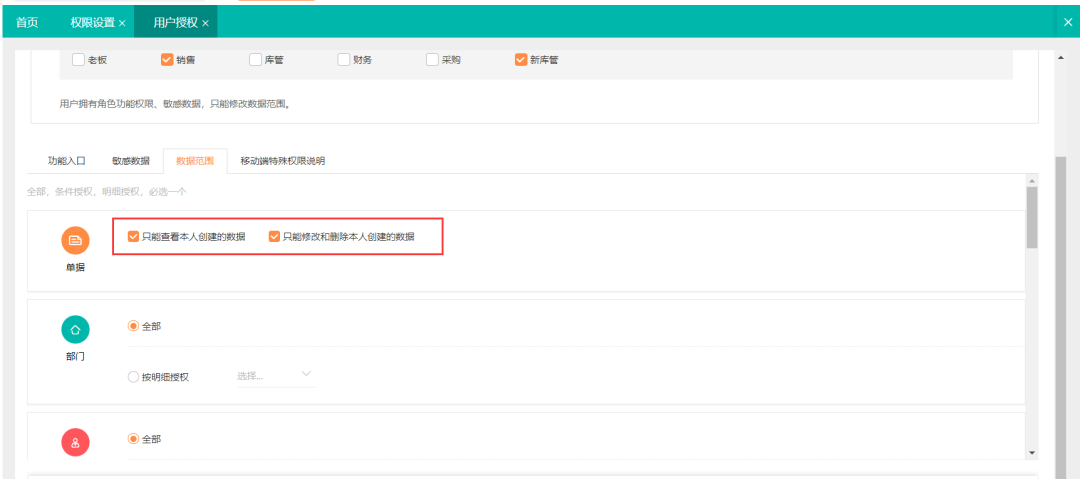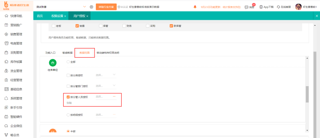 2、內(nèi)部業(yè)務(wù)員互相比價(jià),互相搶客 避免內(nèi)部惡意競(jìng)爭(zhēng),搶客情況,在好生意中,往來單位可以設(shè)置具體的分管人員,通過權(quán)限控制,只看自己的客戶和單據(jù)。 系統(tǒng)管理-權(quán)限設(shè)置-用戶管理來授權(quán)數(shù)據(jù)范圍。