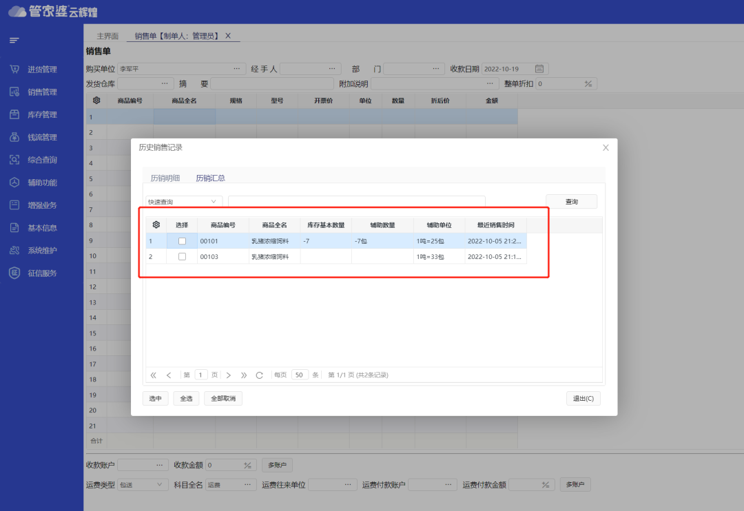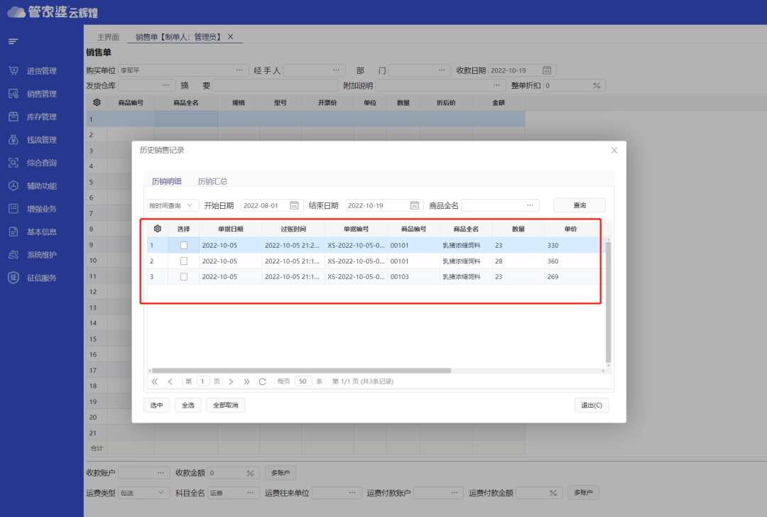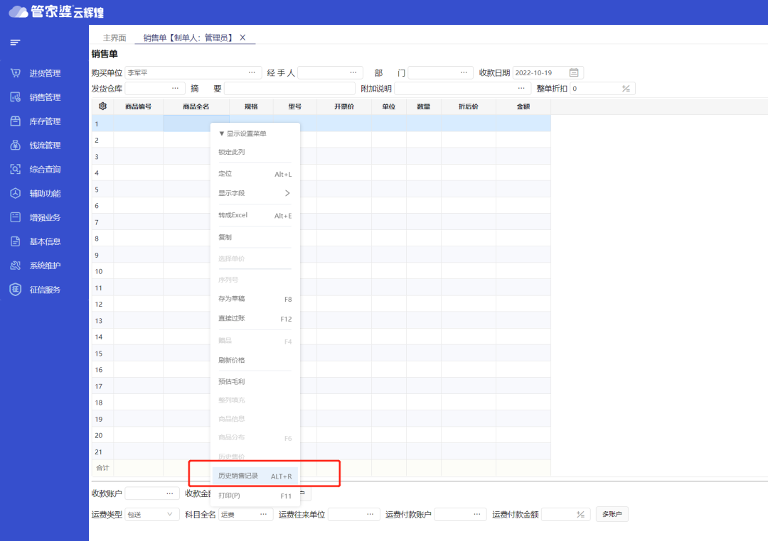 點(diǎn)擊查看大圖 二、在銷售單鼠標(biāo)右鍵,選擇歷史銷售記錄