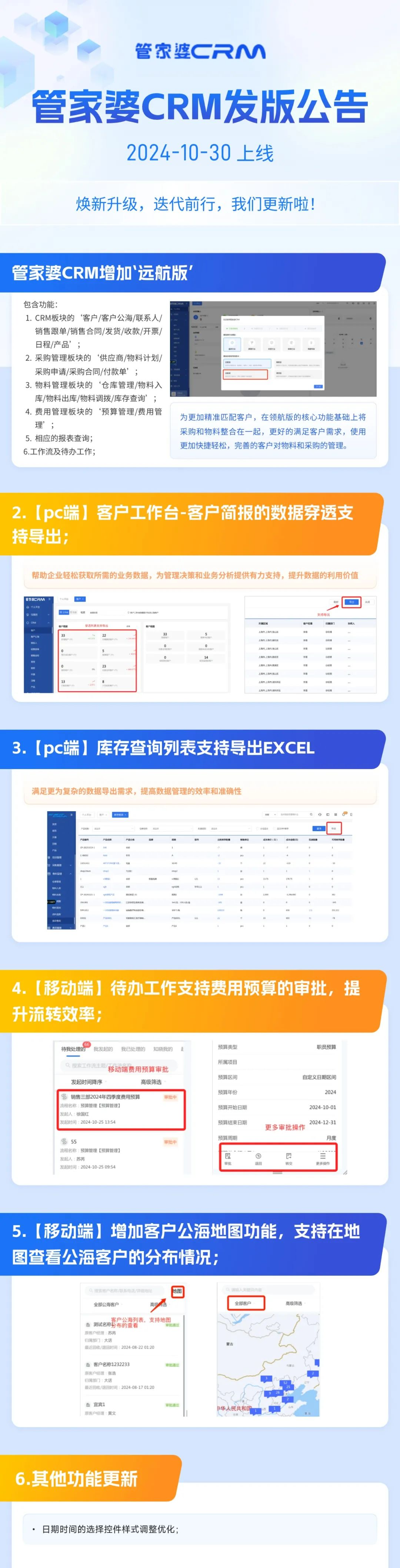 2024年10月30日,管家婆CRM常規(guī)發(fā)版,本次發(fā)版為了滿足企業(yè)的需求,此次功能升級(jí)、更新后: