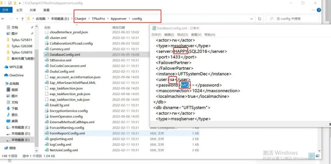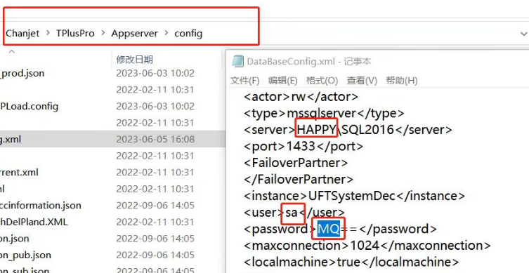 4.軟件安裝路徑下的Chanjet\TPlusPro\Appserver\config文件夾打開,找到DataBaseConfig用記事本打開,里面的計算機名稱、數(shù)據(jù)庫密碼錯誤了,也會導致創(chuàng)建系統(tǒng)庫失敗。