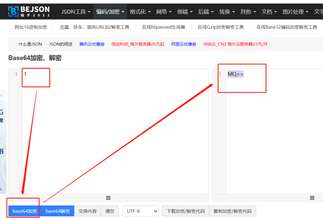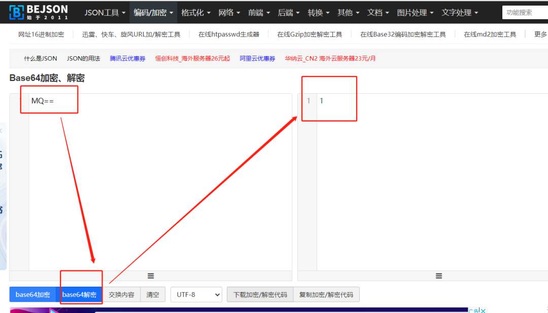 上方圖中HAPPY字段對應的是計算機名字,檢查看下是不是和自己電腦的計算機名稱能對上,若對不上,需要修改成一致的; MQ==對應的是數(shù)據(jù)庫密碼,解密出來發(fā)現(xiàn)和自己設置的密碼不對要進行修改。 可以通過此網(wǎng)址https://www.bejson.com/enc/base64/將數(shù)字進行加密或解密。 具體操作請看下方圖片,通過此辦法來判斷自己的數(shù)據(jù)庫密碼是否是正確的,若錯誤則需要修改,再重新去做數(shù)據(jù)庫配置。
