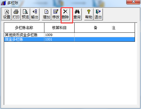(2)刪掉多欄賬,重新增加多欄賬。 方法:依次點(diǎn)擊“總賬”-“賬簿查詢”-“多欄賬”,選中需要?jiǎng)h除的多欄賬名稱,點(diǎn)擊“刪除”: