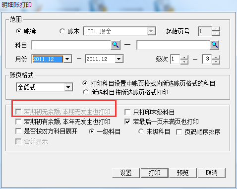 注意:點(diǎn)擊鍵盤前要先點(diǎn)擊下反結(jié)賬的月份,否則有可能沒有反映。 反記賬操作同理 2、打印明細(xì)賬“若期初無余額,本期無發(fā)生也打印”置灰 【問題現(xiàn)象】打印明細(xì)賬時(shí)“若期初無余額,本期無發(fā)生也打印”置灰,不能選擇? 【原因分析】打印明細(xì)賬時(shí)“若期初無余額,本期無發(fā)生也打印”置灰,不能選擇,如下圖: