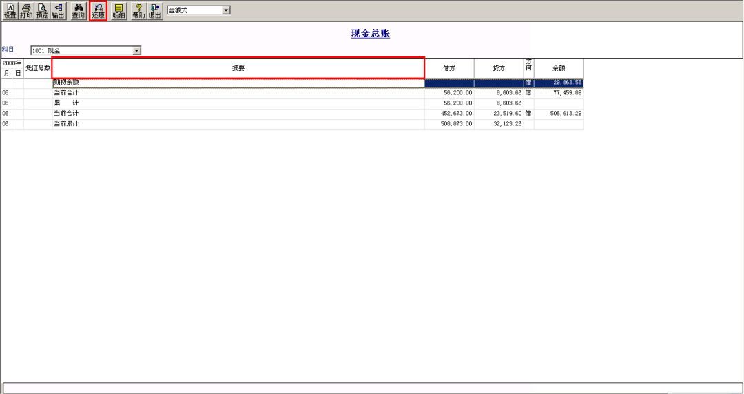 (4)點(diǎn)擊“還原”按鈕,賬簿按設(shè)置好的要求顯示出來