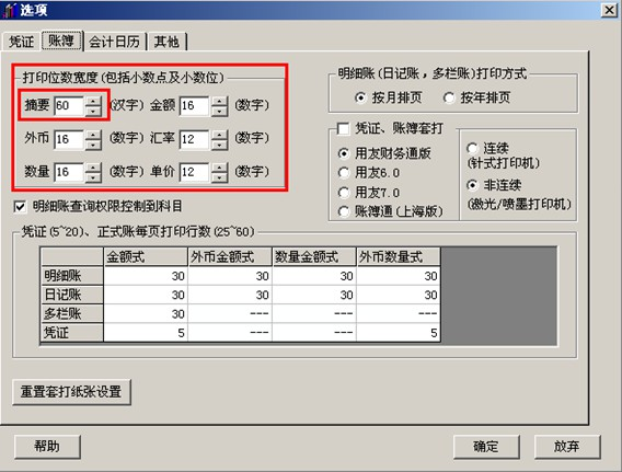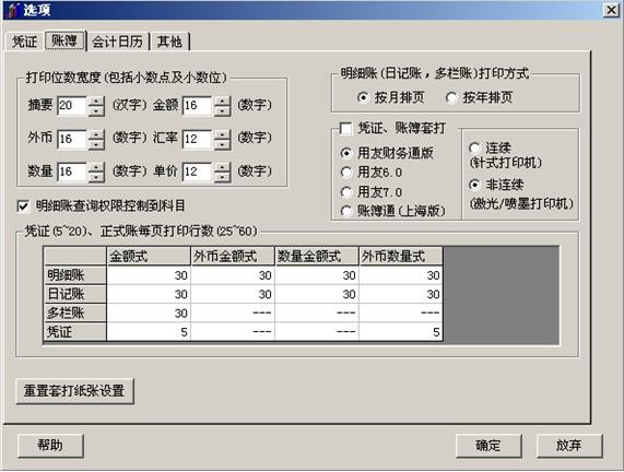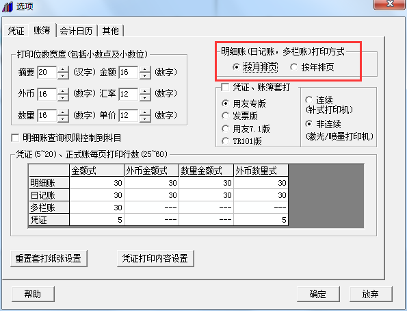 【解決方案】 (1)依次點(diǎn)擊“總賬”-“設(shè)置”-“選項(xiàng)”-“賬簿”頁簽下,明細(xì)賬(日記賬,多欄賬)打印方式改為 “按月排頁”,如下圖: