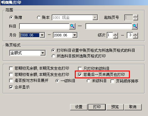 【問題分析】有數(shù)據(jù)需要打印,但是提示沒有“沒有可供打印的科目”,有可能是沒有記賬,再記過帳之后還是不能打印有可能是由于數(shù)據(jù)量太少,不夠一頁所以打印不出來。 【解決方案】 (1)依次點(diǎn)擊“總賬”-“賬簿打印”-“明細(xì)賬簿查詢”,在明細(xì)賬打印查詢條件里面勾選“最后一頁未滿也打印”: