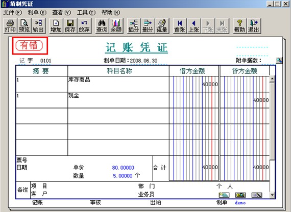 4、憑證之前正常,后面審核時(shí)顯示“有錯(cuò)” 【問題現(xiàn)象】憑證上顯示“有錯(cuò)”? 【原因分析】在審核的時(shí)候,會(huì)發(fā)現(xiàn)有些憑證上面標(biāo)注“有錯(cuò)”字樣,不能審核和記賬, 是由于填制完成憑證后,又對(duì)科目設(shè)置了輔助核算。由于該科目有輔助核算,而這張憑證上又沒有輔助數(shù)據(jù),所以在審核時(shí)就會(huì)標(biāo)注”有錯(cuò)”