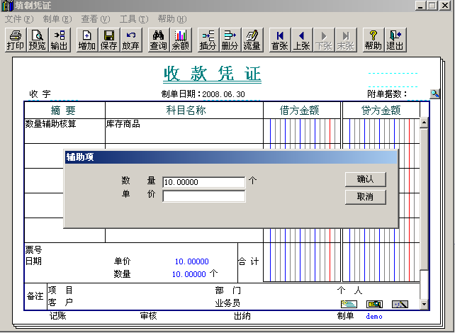 (2)“輔助項(xiàng)”彈出之后,只錄入“數(shù)量”,不錄入“單價(jià)”,然后再在貸方錄入金額,讓其自動(dòng)反算單價(jià)即可。