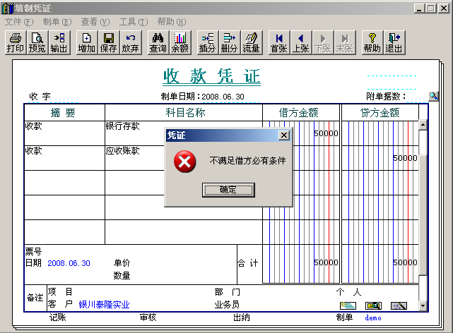6、憑證不能保存 【問題現(xiàn)象】 憑證不能保存,提示“不滿足借方必有(或其它貸方必有等)條件”?