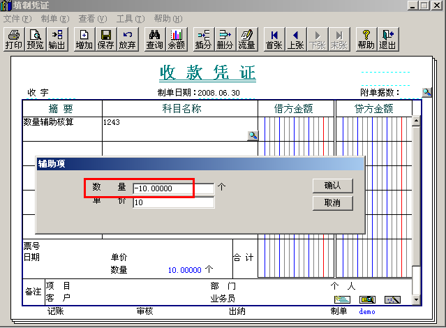 (3)“輔助項(xiàng)”彈出之后,在“數(shù)量”里面錄入負(fù)數(shù),“單價(jià)”正常錄入,那樣在借方就是一筆紅字的分錄,其意義跟貸方藍(lán)字是一樣的。