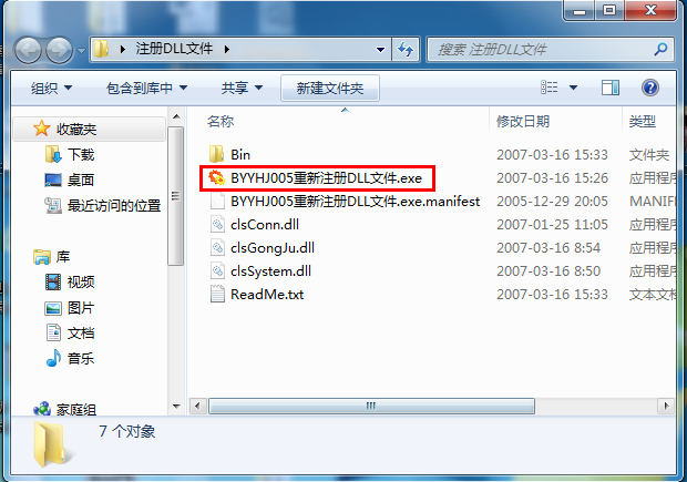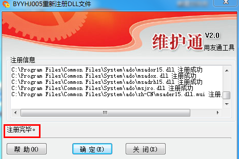 下載后,雙擊:BYYHJ005重新注冊(cè)DLL文件.exe 點(diǎn)擊確定按鈕,等待提示:注冊(cè)完畢。如下圖所示: