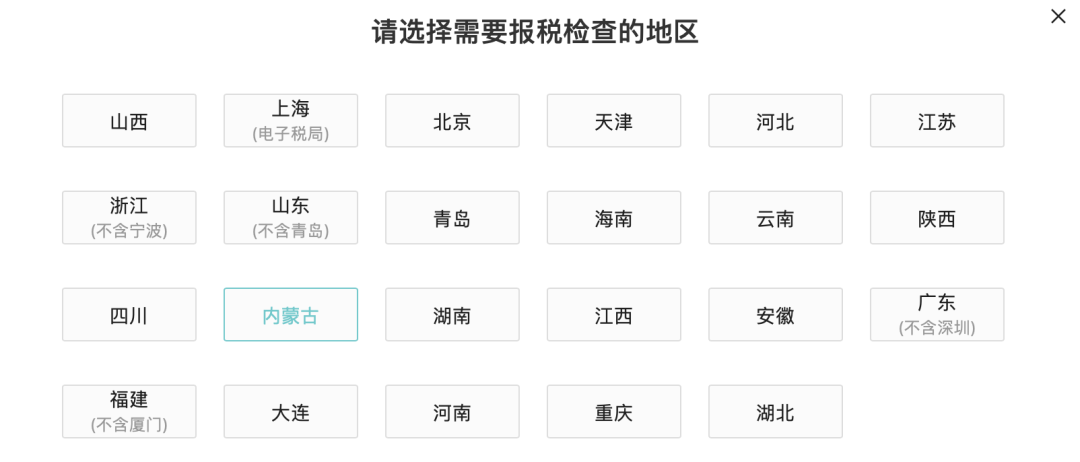 報(bào)稅地區(qū)增加:重慶、河南、大理、內(nèi)蒙古、湖北,現(xiàn)有支持報(bào)稅的稅區(qū)共:23個(gè)。