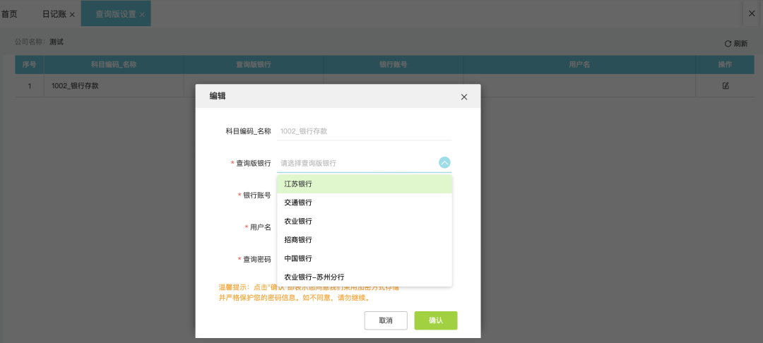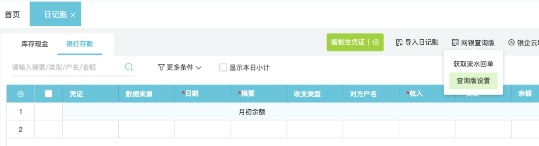 日記賬,可以通過(guò)網(wǎng)銀查詢(xún)版設(shè)置拉取流水、回單。