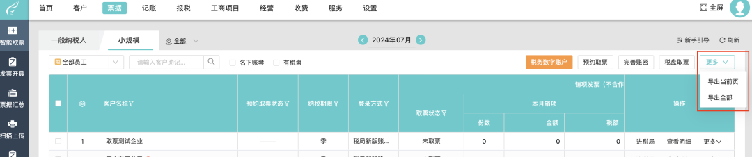 工作臺(tái)——票據(jù)——智能取票,列表右上方增加【更多】按鈕,包括:導(dǎo)出當(dāng)前頁(yè)、導(dǎo)出全部。