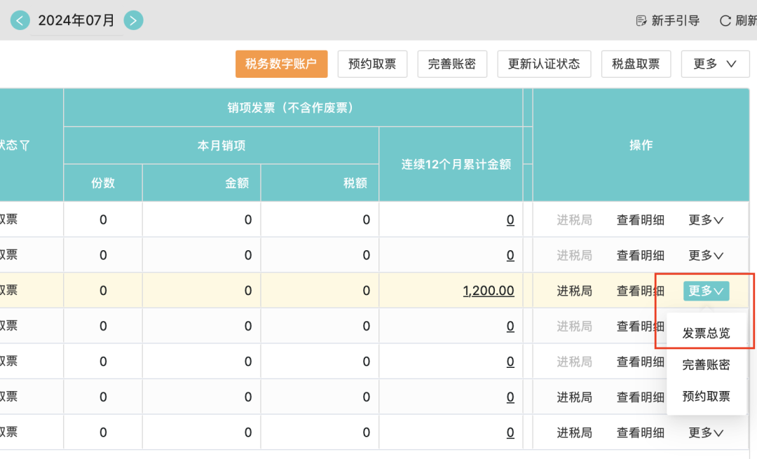 工作臺(tái)——票據(jù)——智能取票,列表行操作【更多】中,增加【發(fā)票總覽】,可快速跳轉(zhuǎn)查看賬套發(fā)票統(tǒng)計(jì)數(shù)據(jù)。