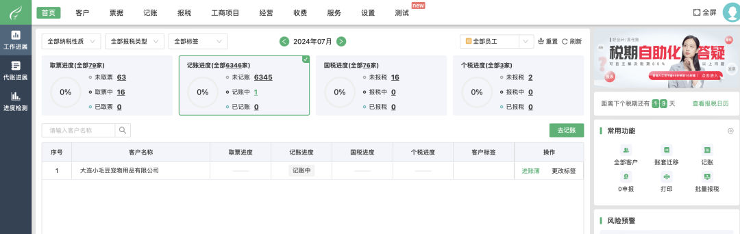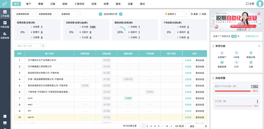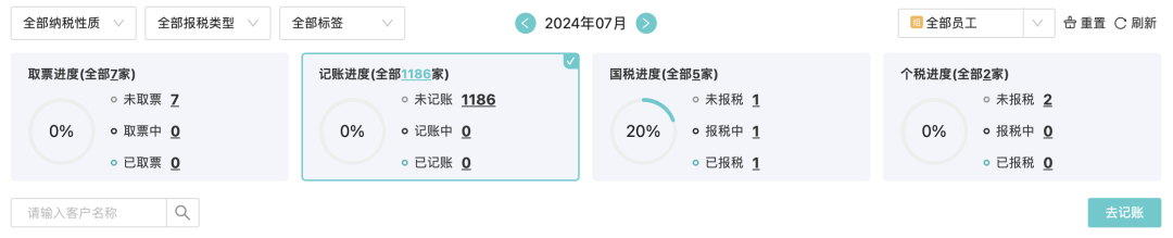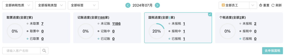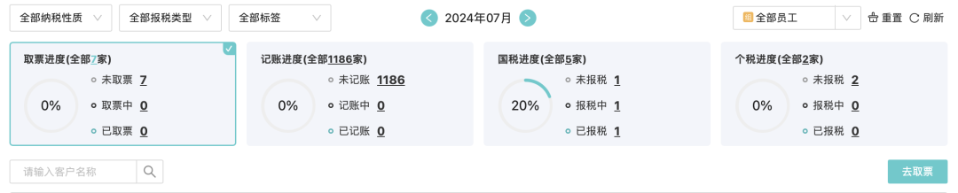 取票進(jìn)度: 1)全部取票客戶(hù):即已完善稅局賬密和登錄方式的全部客戶(hù); 2)未取票:該期間一般納稅人未取票的客戶(hù),和小規(guī)模的銷(xiāo)項(xiàng)發(fā)票是未取票的客戶(hù); 3)取票中:該期間一般納稅人取票中或取票失敗的客戶(hù),和小規(guī)模的銷(xiāo)項(xiàng)發(fā)票是取票中或取票失敗的客戶(hù); 4)已取票:該期間一般納稅人取票成功的客戶(hù),和小規(guī)模的銷(xiāo)項(xiàng)發(fā)票是取票成功的客戶(hù); 5)取票進(jìn)度=已取票/全部取票客戶(hù)。 記賬進(jìn)度: 1)全部記賬客戶(hù):即已建賬、未禁用、未刪除的全部客戶(hù); 2)未開(kāi)始:該期間沒(méi)有記賬憑證的客戶(hù); 3)進(jìn)行中:該期間已有記賬憑證尚未結(jié)賬的客戶(hù); 4)已完成:該期間已結(jié)賬的客戶(hù); 5)記賬進(jìn)度=已完成/全部記賬客戶(hù) 國(guó)稅進(jìn)度: 如果未購(gòu)買(mǎi)一鍵報(bào)稅,會(huì)提示充值購(gòu)買(mǎi),可直接購(gòu)買(mǎi)。如已購(gòu)買(mǎi),則顯示如下指標(biāo): 1)全部國(guó)稅客戶(hù):即已授權(quán)國(guó)稅申報(bào)的全部客戶(hù); 2)未報(bào)稅:該期間申報(bào)狀態(tài)是未申報(bào)的客戶(hù); 3)報(bào)稅中:該期間申報(bào)狀態(tài)是部分申報(bào)的客戶(hù); 4)已報(bào)稅:該期間申報(bào)狀態(tài)是全部申報(bào)的客戶(hù); 5)報(bào)稅進(jìn)度=已報(bào)稅/全部國(guó)稅客戶(hù) 注意:對(duì)于無(wú)需申報(bào)的客戶(hù),不在統(tǒng)計(jì)申報(bào)進(jìn)度統(tǒng)計(jì)范圍內(nèi)。 另,這里只統(tǒng)計(jì)一鍵報(bào)稅執(zhí)行的進(jìn)度,不統(tǒng)計(jì)繳費(fèi)進(jìn)度。 個(gè)稅進(jìn)度: 如果未購(gòu)買(mǎi)個(gè)稅申報(bào),會(huì)提示充值購(gòu)買(mǎi),可直接購(gòu)買(mǎi)。如已購(gòu)買(mǎi),則顯示如下指標(biāo): 1)全部個(gè)稅客戶(hù):即已授權(quán)個(gè)稅申報(bào)的全部客戶(hù); 2)未報(bào)稅:該期間申報(bào)狀態(tài)是未申報(bào)的客戶(hù); 3)報(bào)稅中:該期間申報(bào)狀態(tài)是申報(bào)中、申報(bào)失敗、待更正、更正中、更正失敗的客戶(hù); 4)已報(bào)稅:該期間申報(bào)狀態(tài)是申報(bào)成功、更正成功的客戶(hù); 5)報(bào)稅進(jìn)度=已報(bào)稅/全部個(gè)稅客戶(hù) 注意:對(duì)于無(wú)需申報(bào)的客戶(hù),不在統(tǒng)計(jì)申報(bào)進(jìn)度統(tǒng)計(jì)范圍內(nèi)。 另,這里只統(tǒng)計(jì)一鍵報(bào)稅執(zhí)行的進(jìn)度,不統(tǒng)計(jì)繳費(fèi)進(jìn)度。 對(duì)于如上指標(biāo),支持點(diǎn)擊篩選,下方的客戶(hù)列表會(huì)直接刷新顯示相應(yīng)客戶(hù)。