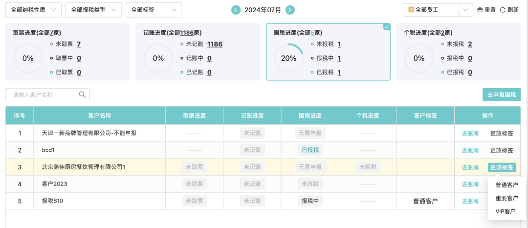 3.客戶(hù)列表顯示客戶(hù)名稱(chēng)、取票進(jìn)度、記賬進(jìn)度、國(guó)稅進(jìn)度、個(gè)稅進(jìn)度、客戶(hù)標(biāo)簽等,可直接點(diǎn)擊進(jìn)賬套、更改客戶(hù)標(biāo)簽。