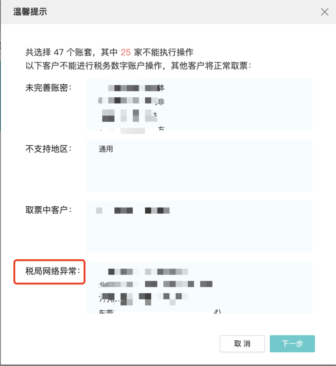 2.取票任務(wù)執(zhí)行前增加稅局通道是否正常的判斷如果稅局通道關(guān)閉,發(fā)取票任務(wù)之前進(jìn)行提示:稅局網(wǎng)絡(luò)異常,任務(wù)無(wú)法發(fā)起,避免因通道關(guān)閉導(dǎo)致取票任務(wù)失敗,對(duì)客戶(hù)造成困擾。