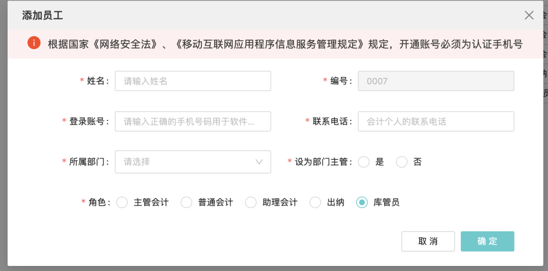 二、角色權(quán)限細(xì)化1.增加庫(kù)管角色為支持代賬公司對(duì)庫(kù)管員操作的特殊要求,默認(rèn)增加庫(kù)管角色,在啟用庫(kù)存核算模塊情況下,即可設(shè)置相應(yīng)的庫(kù)管員只操作庫(kù)存核算相關(guān)的功能。