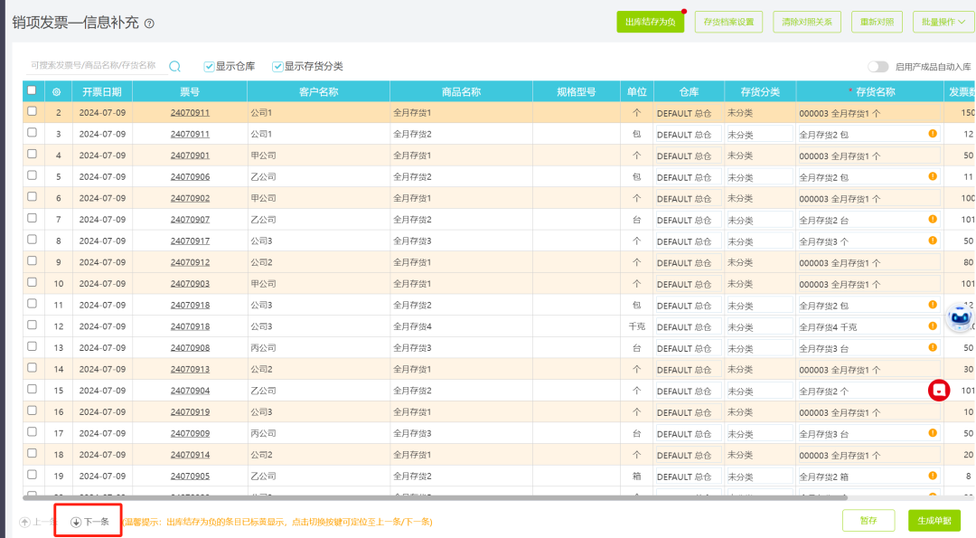 3)定位發(fā)票 聯(lián)查結(jié)存為負(fù)的存貨,聯(lián)查到 發(fā)票推單頁(yè)面,定位發(fā)票 【下一條】定位發(fā)票