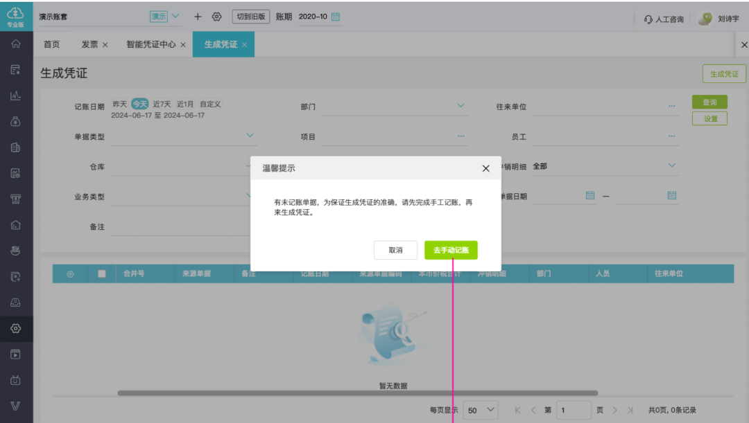 (4)存在未完成記賬的單據(jù),打開(kāi)憑證中心-業(yè)務(wù)單據(jù)記賬,會(huì)有如下提示