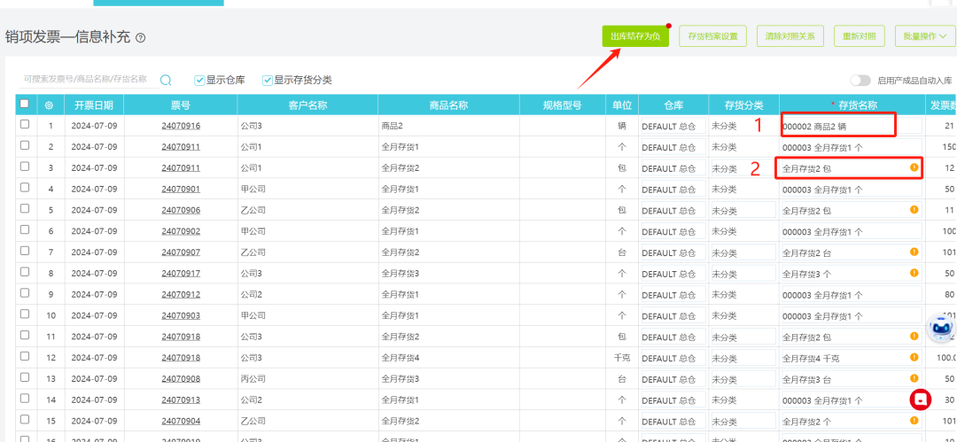 2.出庫(kù)結(jié)存為負(fù)匯總背景 銷(xiāo)項(xiàng)發(fā)票生成銷(xiāo)售出庫(kù)單,沒(méi)有結(jié)存數(shù)量提醒,用戶(hù)生成庫(kù)存單據(jù)后才發(fā)現(xiàn),出庫(kù)數(shù)量大于但是結(jié)存數(shù)量,導(dǎo)致結(jié)存為負(fù)數(shù)。 為了提前規(guī)避這種情況,在銷(xiāo)項(xiàng)發(fā)票推單頁(yè)面,增加本次出庫(kù) 預(yù)計(jì)結(jié)存為負(fù)的匯總。 解決方案: 在銷(xiāo)售發(fā)票生成銷(xiāo)售出庫(kù)單時(shí),推單頁(yè)面增加【出庫(kù)結(jié)存為負(fù)】匯總頁(yè)面。將推單頁(yè)面, 指定的 存貨, 現(xiàn)存量小于 預(yù)計(jì)出庫(kù)數(shù)量 匯總出來(lái)。 用戶(hù)可以在推單頁(yè)面聯(lián)查到對(duì)應(yīng)的存貨記錄 1)現(xiàn)存量不足,提示 銷(xiāo)項(xiàng)發(fā)票生成銷(xiāo)售出庫(kù)單,在推單頁(yè)面,如果指定的【存貨名稱(chēng)】現(xiàn)存量不足 【結(jié)存為負(fù)】匯總,會(huì)有紅點(diǎn)提示