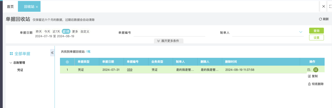 在回收站列表,對(duì)于憑證單據(jù),可以使用操作列功能: 1)查看詳情:查看該憑證的具體內(nèi)容 2)復(fù)制:即打開(kāi)一個(gè)新憑證頁(yè)面窗口,該張已刪除的憑證會(huì)自動(dòng)帶入,點(diǎn)擊保存即時(shí)生成一張新憑證。 (注意:通過(guò)復(fù)制方式產(chǎn)生新憑證,而非直接恢復(fù)原有憑證) 3)徹底刪除:從回收站中徹底刪除該張憑證。