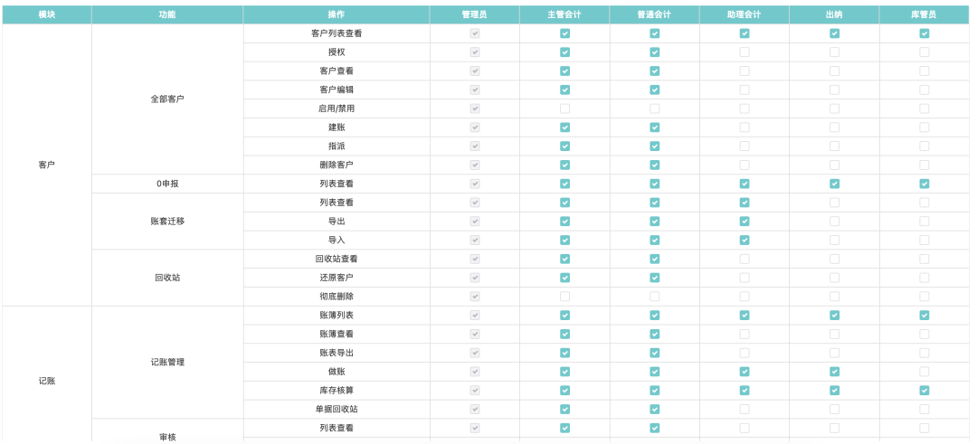 2.記賬等權(quán)限細(xì)化記賬管理權(quán)限進(jìn)行如下細(xì)分: 1)賬簿查看:包括賬套內(nèi)除發(fā)票、日記賬、工資表外所有的查看權(quán)限,不包括賬表導(dǎo)出; 2)賬表導(dǎo)出:新增該權(quán)限,允許對(duì)賬套內(nèi)的賬表進(jìn)行導(dǎo)出操作; 3)做賬:包括賬套內(nèi)除發(fā)票、日記賬、工資表外所有的編輯權(quán)限; 4)庫(kù)存核算:新增該權(quán)限,包括賬套內(nèi)庫(kù)存核算和相關(guān)的基礎(chǔ)設(shè)置權(quán)限; 票據(jù)錄入權(quán)限描述如下: 1)列表查看:包括賬套內(nèi)發(fā)票、日記賬、工資表等查看權(quán)限; 2)票據(jù)編輯:包括賬套內(nèi)發(fā)票、日記賬、工資表等編輯權(quán)限;