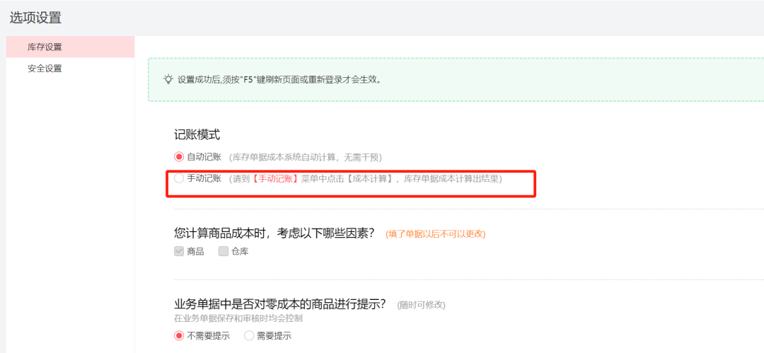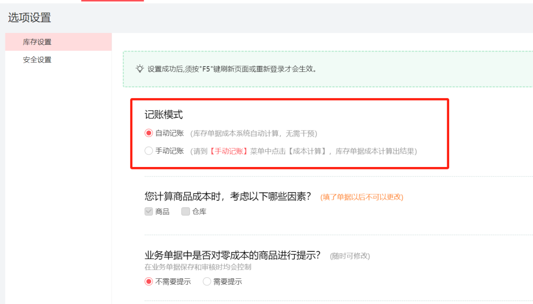 新方案: 系統(tǒng)根據(jù)記賬的單據(jù)量, 系統(tǒng)自動(dòng)切換為【成本時(shí)時(shí)計(jì)算】【成本批量計(jì)算】。 數(shù)據(jù)量大,系統(tǒng)自動(dòng)切換到【成本批量計(jì)算】,如果想更快看到成本結(jié)算結(jié)果,可以打開(kāi)【手工記賬】頁(yè)面,發(fā)起成本計(jì)算 (1)在庫(kù)存選項(xiàng)里將 【記賬模式 】取消,變?yōu)橄到y(tǒng)自動(dòng)切換【成本時(shí)時(shí)計(jì)算】【成本批量計(jì)算】