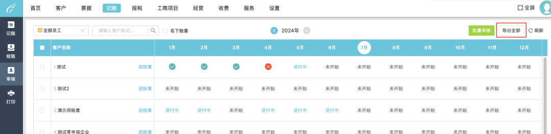 注意:單據(jù)回收站僅保留近六個(gè)月的數(shù)據(jù),過(guò)期后數(shù)據(jù)會(huì)自動(dòng)清除 2.批量審核支持導(dǎo)出記賬工作臺(tái)審核菜單,支持【導(dǎo)出全部】,便于審核人員每月核對(duì)賬套記賬審核情況。