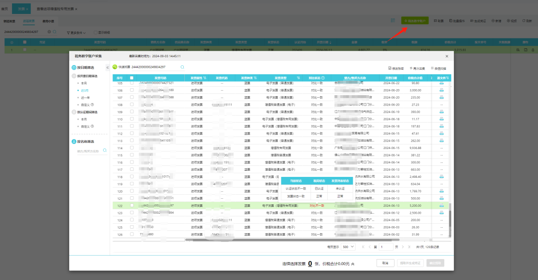 一、發(fā)票相關(guān)1.發(fā)票狀態(tài)比對(1)場 景:使用稅務(wù)數(shù)字賬戶取票,發(fā)票提取頁與發(fā)票列表發(fā)票 :發(fā)票認賬狀態(tài)、發(fā)票狀態(tài)不同,這類發(fā)票在發(fā)票提取頁面會會顯示出來。但是沒有特殊標識,用戶會認為發(fā)票沒有判重 (2)解決方案:發(fā)票列表中的發(fā)票,發(fā)票狀態(tài)、認證狀態(tài)不同,會在發(fā)票提取頁面,標識【狀態(tài)不一致】原因