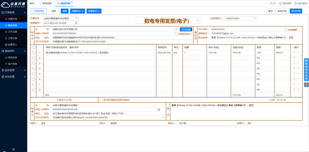 從業(yè)務(wù)系統(tǒng)選中的單據(jù),填充內(nèi)容時(shí)會(huì)先以維護(hù)后的開(kāi)票資料優(yōu)先,沒(méi)維護(hù)的在當(dāng)前界面維護(hù),也可以在商品信息頁(yè)面維護(hù)后刷新頁(yè)面獲取最新數(shù)據(jù),維護(hù)一次基本信息后理論上可實(shí)現(xiàn)選單即開(kāi)票的目的。