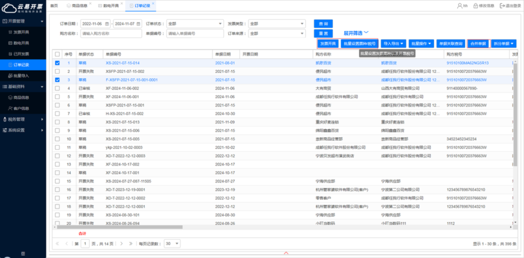 信息維護(hù)過(guò)之后,調(diào)單之后清單明細(xì)自動(dòng)帶入維護(hù)好的信息,省去維護(hù)清單的工作,只需簡(jiǎn)單檢查即可。系統(tǒng)還可以合并相同客戶單據(jù)一起開(kāi)具,和至多同時(shí)提交200張不同客戶的單據(jù)功能,大大降低工作量,提高開(kāi)票效率。